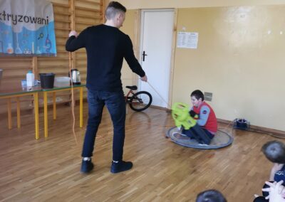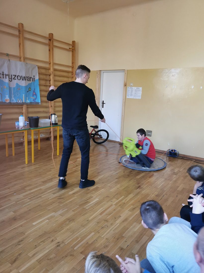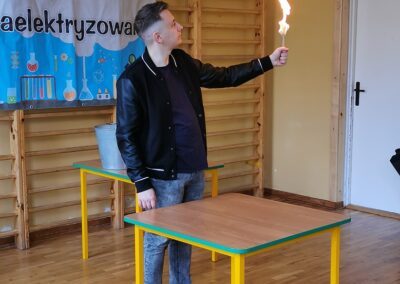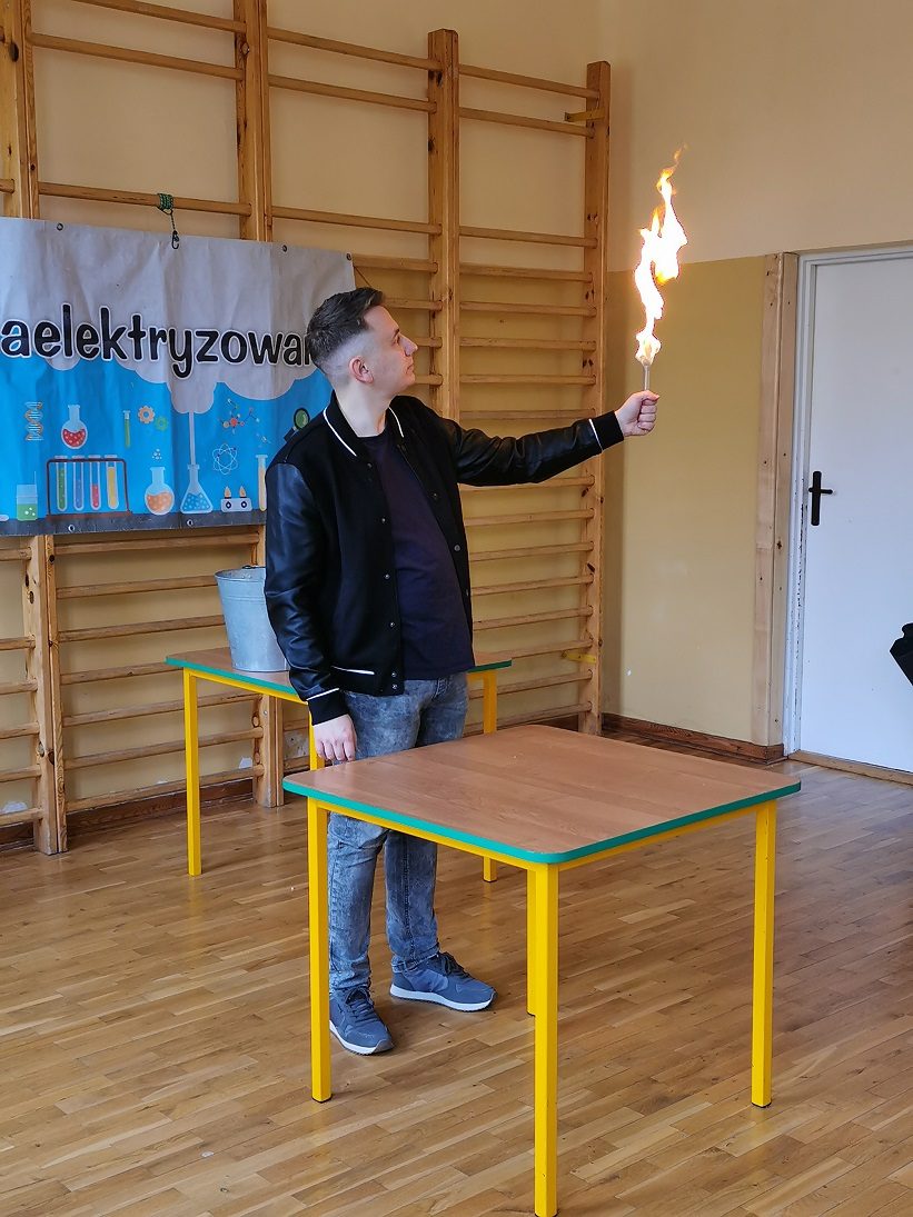 22 października 2021r. uczniowie mieli okazję wziąć udział w nietypowej lekcji fizyki i chemii, przeprowadzonej przez grupę „Zaelektryzowani”. W ramach tego niezwykłego widowiska dzieci i starsi uczniowie mieli okazję uczestniczyć w eksperymentach związanych z powietrzem (jazda poduszkowcem) czy  spalaniem gazów. Było także wiele innych, „wybuchowych”, chemicznych doświadczeniach. Dużo śmiechu dostarczyły zabawy helem. Emocje wzbudził również palący się stolik ze szkolnej biblioteki. Jakże duże było zdziwienie uczniów, kiedy po pożarze,  okazało się, że stół jest w nienaruszonym stanie.