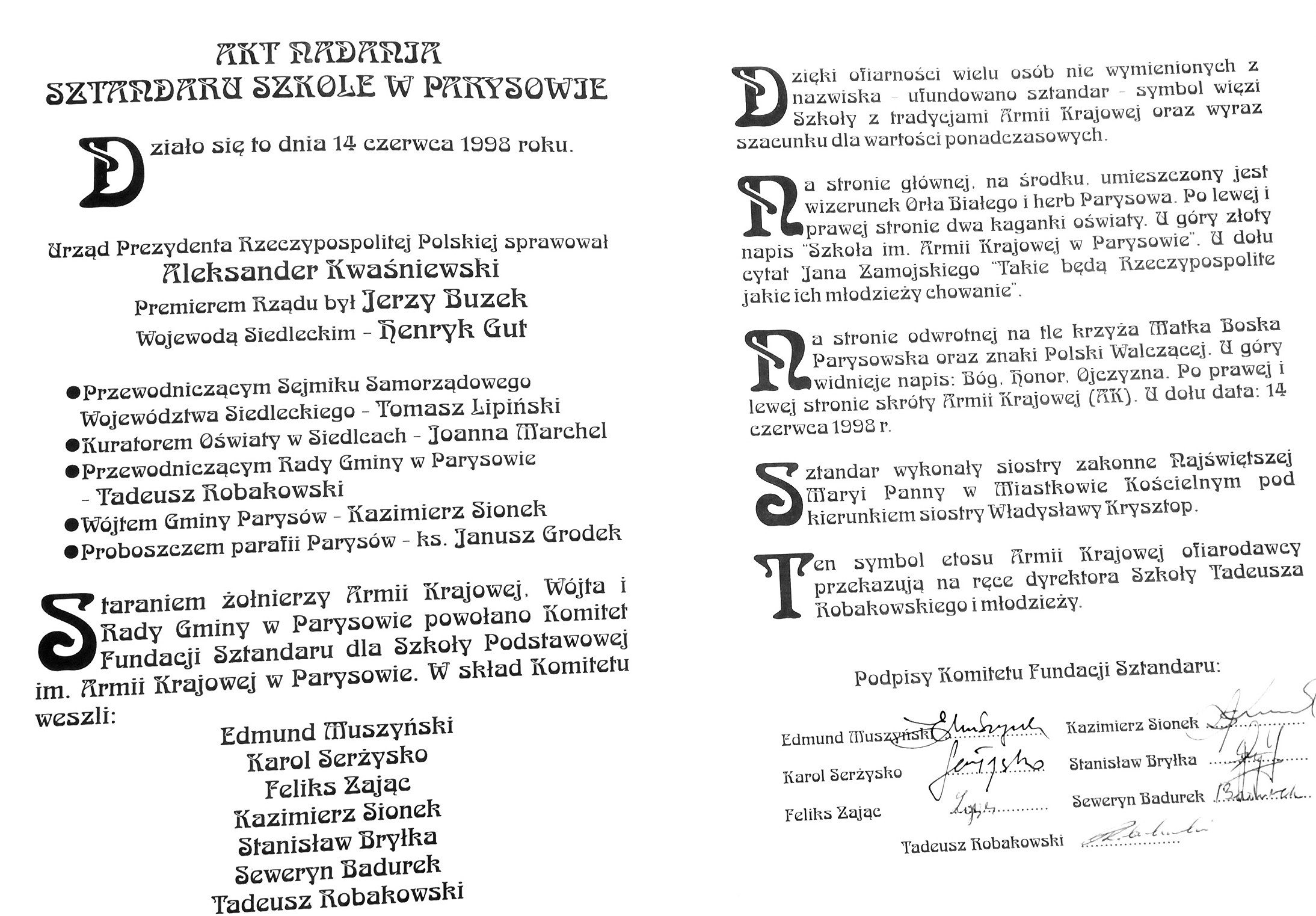 Oficjalna część uroczystości odbyła się na dużej sali gimnastycznej. Po wprowadzeniu sztandarów i odśpiewaniu hymnu państwowego, pan dyrektor  Tadeusz Robakowski powitał dostojnych gości: Kazimierza Sionka – Wójta Gminy Parysów, Senatora, Jerzego Baranowskiego Kuratora Oświaty,  Wojciecha Czeplińskiego oraz przedstawicieli  Armii Krajowej – Edmunda Muszyńskiego,  Irenę  Zwierz i Janinę Świątek.