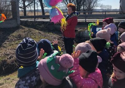 Kulminacyjnym momentem tego dnia był spacer do pobliskiego strumyka. Dzieci radośnie maszerowały w wiosennym korowodzie trzymając w ręku kolorowe kwiaty oraz pompony. Na czele korowodu szła pani Danusia wraz z kukłą- Marzanną symbolizującą zimę. Dzieci wraz z paniami pożegnały kukłę i pozwoliły jej odpłynąć do morza. Jesteśmy pewni, że starania naszych wspaniałych przedszkolaków sprawią, że Wiosna zawita do nas na dobre.