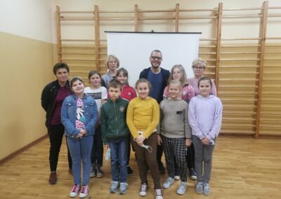Podczas spotkania wytworzyła się niezwykła atmosfera. Dzieci bardzo chętnie słuchały opowieści, głownie o podróży do Azji, oraz wrażeń z ostatniej wyprawy Pana Piotra na Islandię. Przekaz był bogato ilustrowany fotografiami z prywatnych zbiorów. Pan Piotr opowiedział wiele na temat egzotycznej przyrody i zjawisk geograficznych, o których uczniowie czytają w podręcznikach szkolnych. Zachęcał młodzież do intensywnej nauki języków obcych, podając przykłady z życia, kiedy znajomość języka okazała się podstawą do wyjścia z trudnej sytuacji lub uniknięcia nieporozumienia. Najbardziej jednak zwracał uwagę na konieczność ruchu i przebywania na świeżym powietrzu każdego dnia. Niechęć młodych ludzi do uprawiania sportu uznał za jedno z groźniejszych zjawisk współczesnego świata.