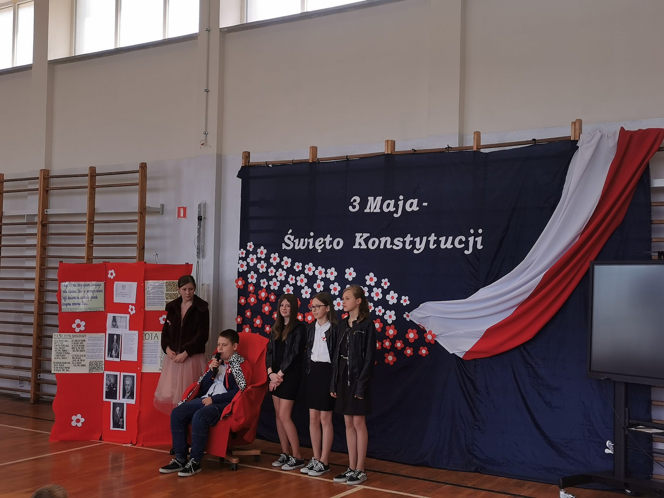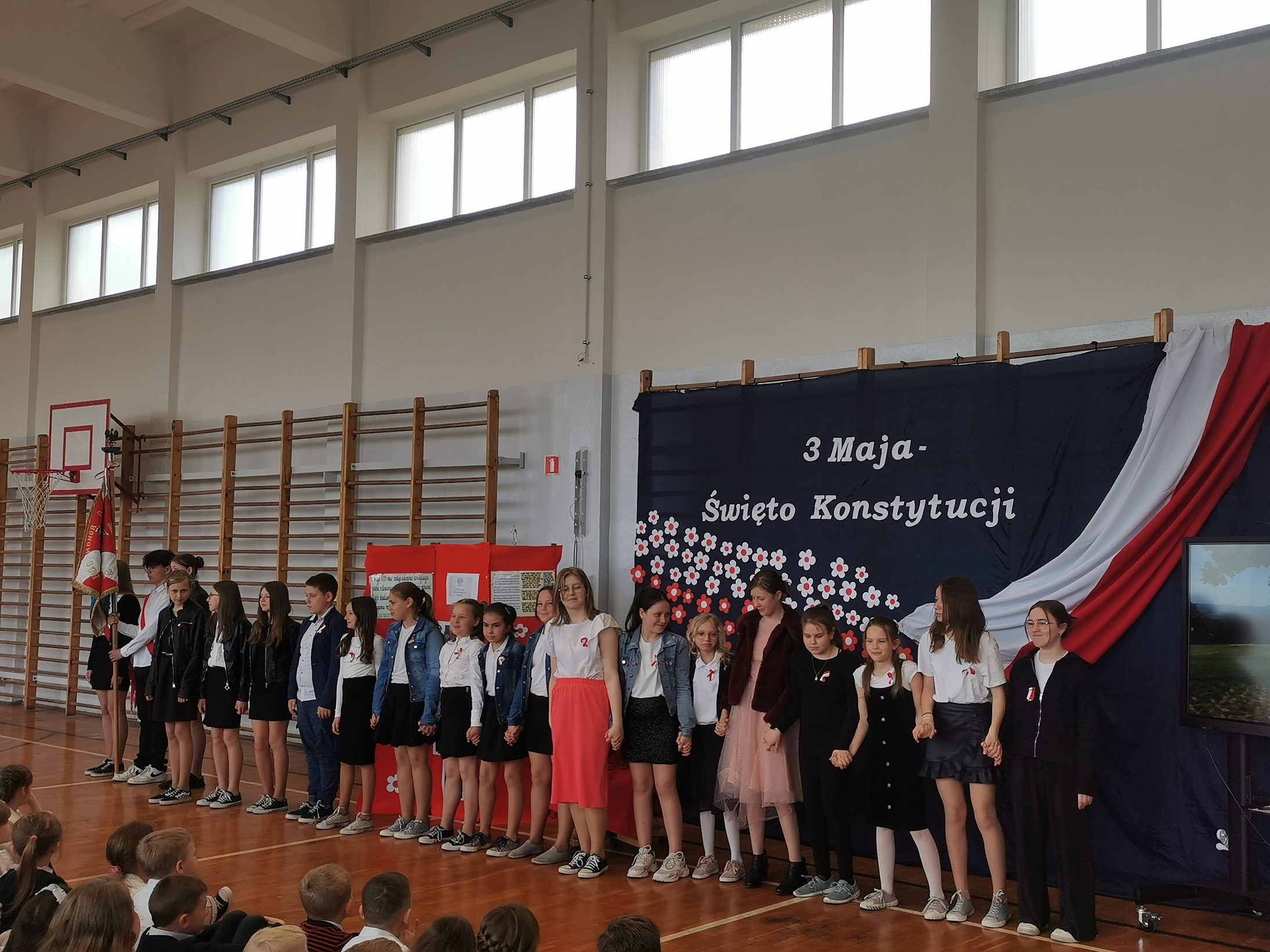 Święto Konstytucji 3 MajaUroczysta akademia z okazji Święta Konstytucji 3 Maja odbyła się w naszej szkole w dniu 4 maja 2023r. W programie przedstawiającym wydarzenia z czasów Sejmu Wielkiego, w tym uchwalenie pierwszej w Europie i drugiej na świecie Konstytucji w dniu 3 maja 1791 r, wystąpili uczniowie klas 5a i 4a, przygotowani przez panią Justynę Płatek oraz przez panią Iwonę Skłodowską. Krótka, ale bardzo wymowna scenka, przypomniała wszystkim zgromadzonym, obrady Sejmu Czteroletniego, zakończone uchwaleniem Konstytucji. Dekoracja w barwach narodowych, czerwieni i bieli, a także symbole narodowe, wprowadziły zebranych w podniosły, patriotyczny nastrój. Po zakończeniu występu została przedstawiona prezentacja ukazująca piękno naszego kraju. Uroczystość odbyła się w obecności pocztu sztandarowego oraz pani wicedyrektor Małgorzaty Borkowskiej-Całki.