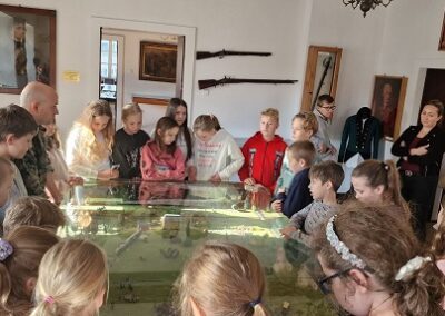 Pierwszym punktem wycieczki było zwiedzanie Muzeum im. Tadeusza Kościuszki w Maciejowicach. Podczas lekcji muzealnej „Sekrety Szkoły Rycerskiej” uczniowie wysłuchali opowieści o życiu i działalności Tadeusza Kościuszki. Poznali elementy musztry kadeckiej i przymierzyli mundury z tej epoki historycznej. Wykazali się umiejętnością pisania gęsim piórem.