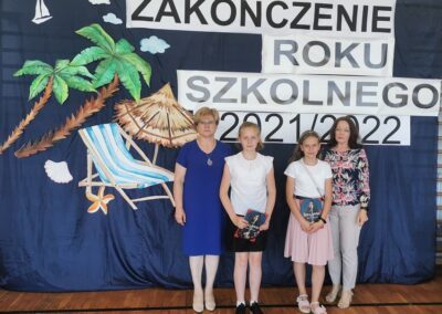 Zakończenie roku szkolnego 2021/22Po mszy świętej, odprawionej w kościele parafialnym o godz. 9.00, wszyscy zgromadzili się w sali gimnastycznej. Pani dyrektor Irena Mazur wręczyła nagrody książkowe uczniom, kończącym ten rok szkolny z wyróżnieniem. W swoim przemówieniu pochwaliła uczniów za ciężką pracę i pogratulowała rodzicom tak zdolnych pociech.